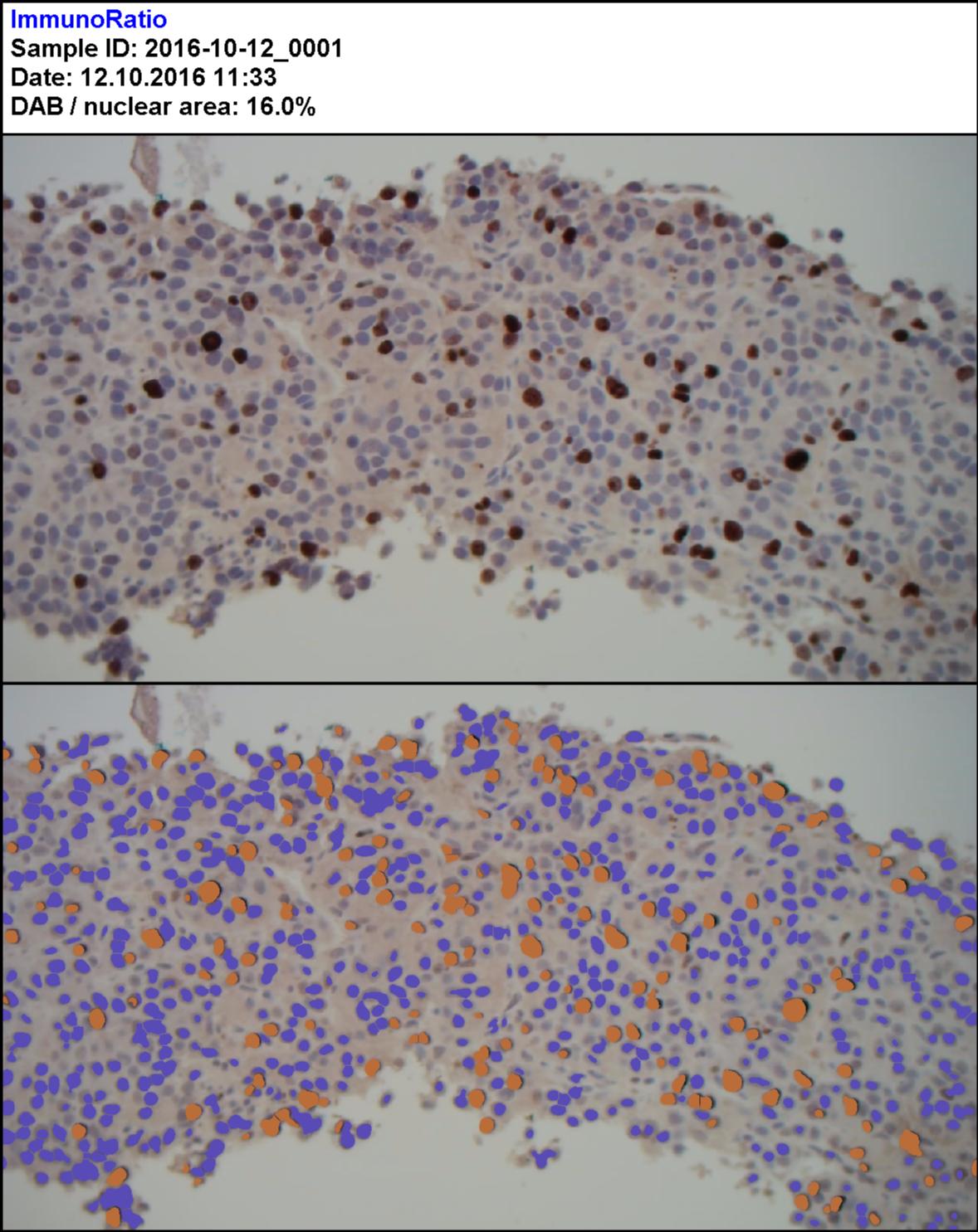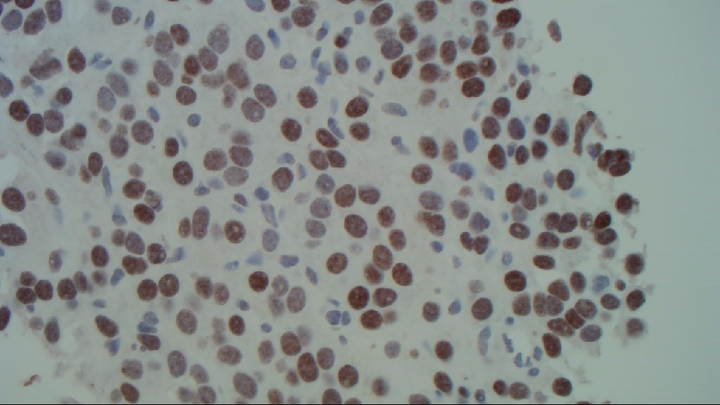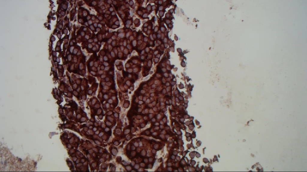 2. Scanty fragments of cohesive tumour cells with a packeted architecture and minimal nuclear pleomorphism. A single mitotic figure is identified but there is insufficient material for a formal mitotic count. The tumour cells are immunopositive for MNF116 (with paranuclear accentuation), diffuse nuclear TTF 1, chromogranin, and the MIB-1 proliferation index is 16%.