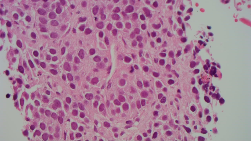 1. Dissociated fragments of tumour with mild pleomorphism, round to oval nuclei and nucleoli are not easily seen. There are occasional mitotic figures and focal punctate necrosis but there is insufficient material for a formal mitotic count/grading.
